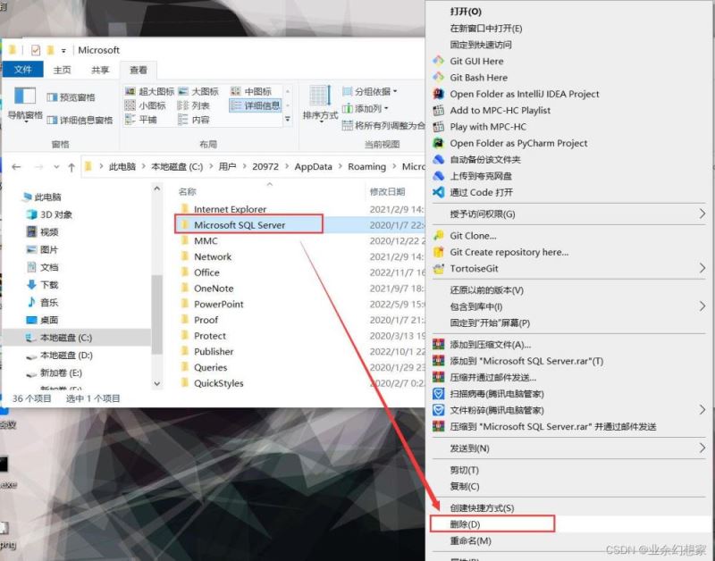 进入 C:\Users\20972\AppData\Roaming\Microsoft 文件夹下(就是 C:\用户\你自己电脑的用户名\AppData\Roaming\Microsoft,这里我的用户名叫20972),找到 Microsoft SQL Server 文件夹 鼠标【右键】-【删除】