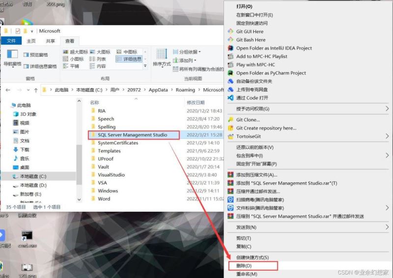 在 C:\Users\20972\AppData\Roaming\Microsoft 文件夹下(就是刚刚这个文件夹下),找到 SQL Server Management Studio 文件夹 鼠标【右键】-【删除】