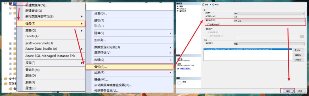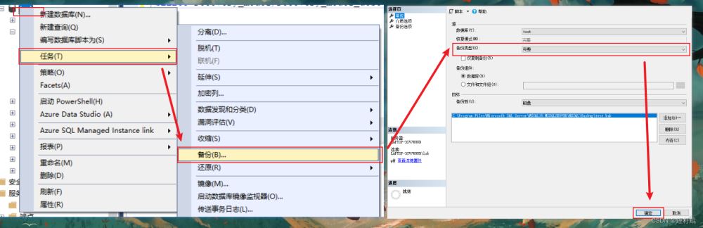 选中数据库=》右键菜单,选择【任务】=》选择【备份】=》备份类型,选择【完整】=》确定