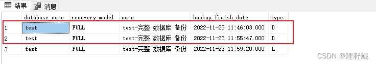 SELECT database_name,recovery_model,name, backup_finish_date,type FROM msdb.dbo.backupset如:本人刚才操作了两次数据完整备份和一次事务日志备份,查询结果如下,