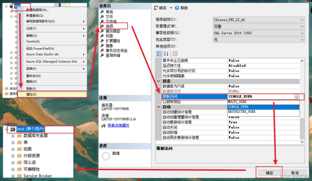 当我们将限制访问设置为【SINGLE_USER】后,我们会发现 数据库后面会附加上【单个用户】标志。