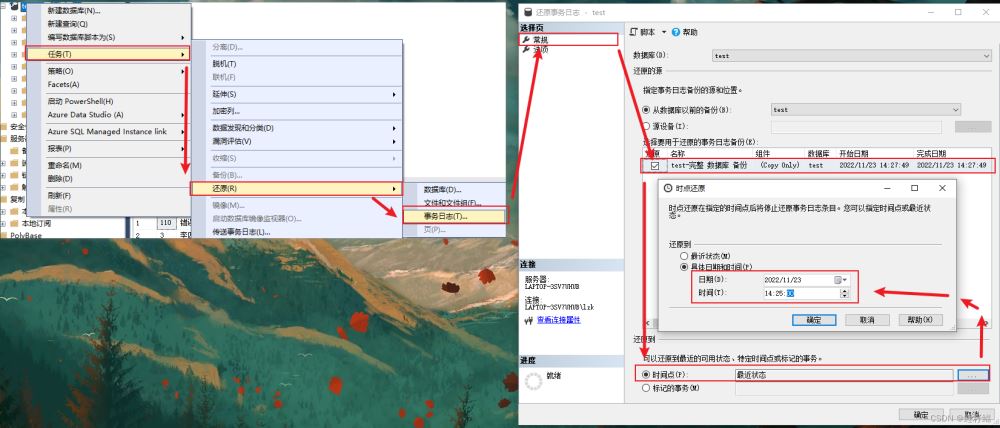 - 12:05 我们发现自己误操作了,马上设置访问权限,进行事务日志备份(这很关键),此时我们就有了2022-10-11所有的完整数据,以及到2022-10-12 12:05所有的事务日志。那么我们就可以根据2022-10-11的完整数据以及2022-10-12 12:05 的事务日志去反推12:00的数据。因此我们需要做的第一个操作先还原2022-10-11的完整数据备份,然后还原2022-10-12 12:05事务日志备份,并且设置还原的时间点。最后数据库系统会根据完整数据以及事务日志备份和设置的还原时间点去恢复数据。