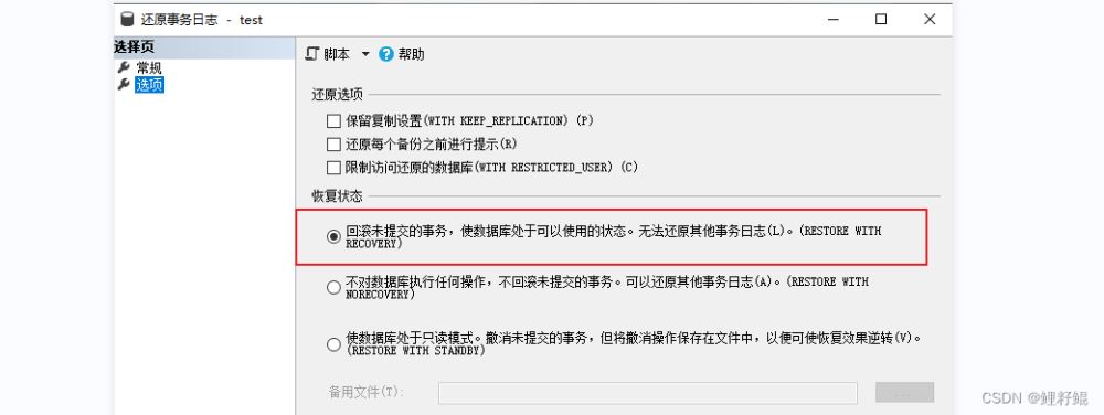 - 设置完还原的时间点后,在【选项】这一项设置中,设置恢复状态为回滚未提供事务,使用数据库处于可以使用的状态