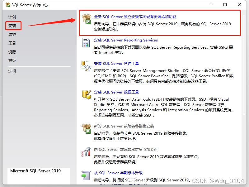 打开后选择“安装”,点击“全新SQL Server 独立安装或向现有安装添加功能”。