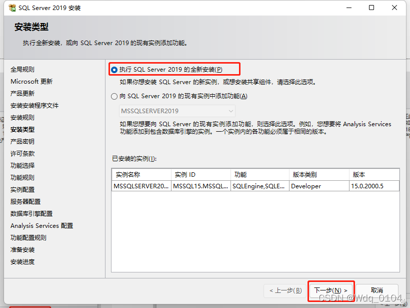 选择“执行SQL Server 2019 的全新安装”,点击“下一步”。