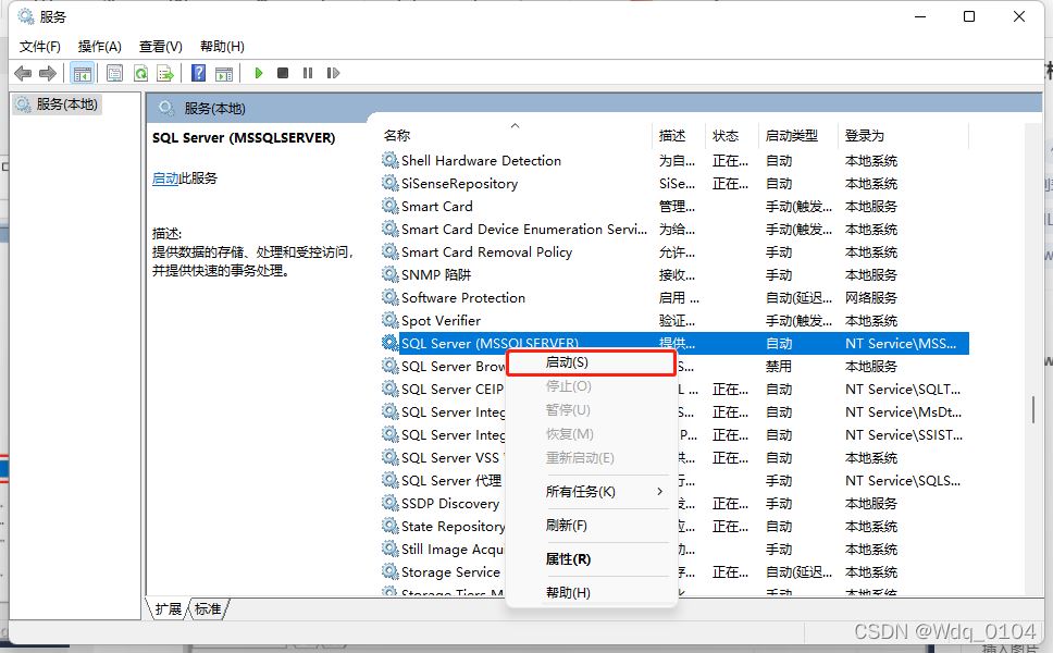 右键点击“启动”,等待启动完成后,回到SQL Server 管理工具进行登录。