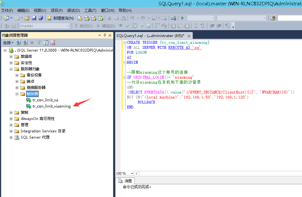 到此这篇关于SqlServer服务中利用触发器对指定账户进行登录ip限制提升安全性的文章就介绍到这了,更多相关SqlServer服务登录ip限制内容请搜索编程学习网以前的文章希望大家以后多多支持编程学习网!