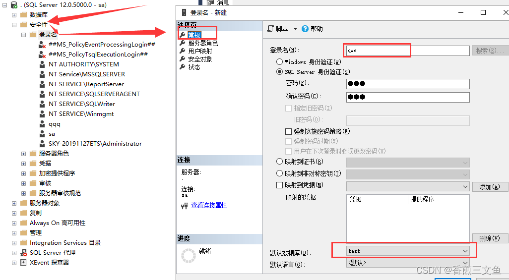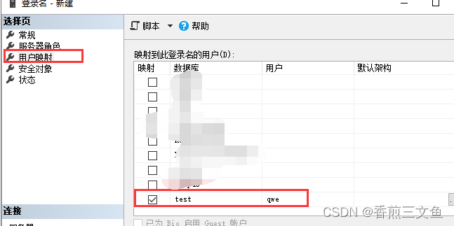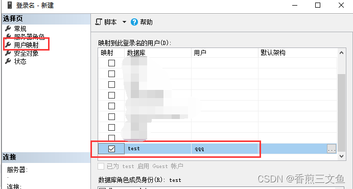 1.创建用户名 选择默认数据库 服务器角色默认为public 用户映射选择指定数据库