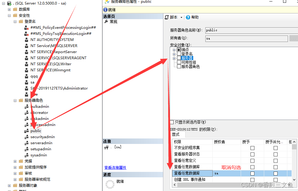 安全性——服务器角色——找到public——属性——将服务器中的查看任意数据库 取消勾选
