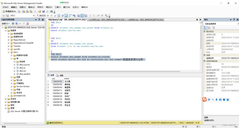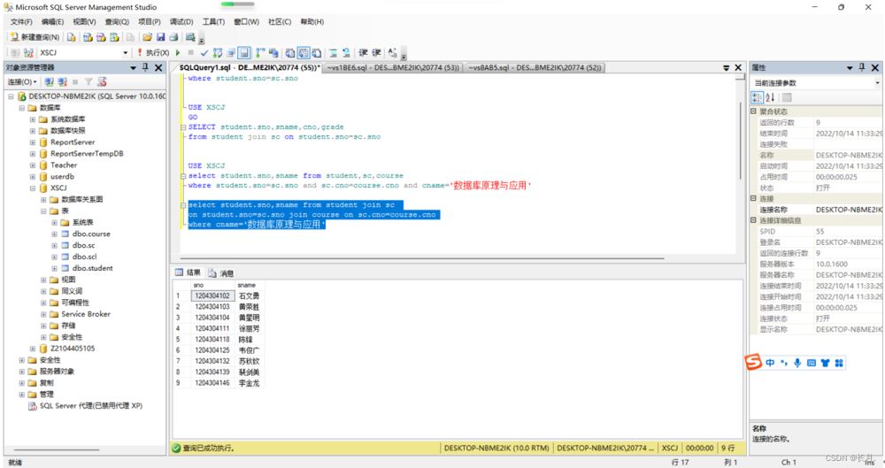 where student.sno=sc.sno and sc.cno=course.cno and cname='数据库原理与应用'