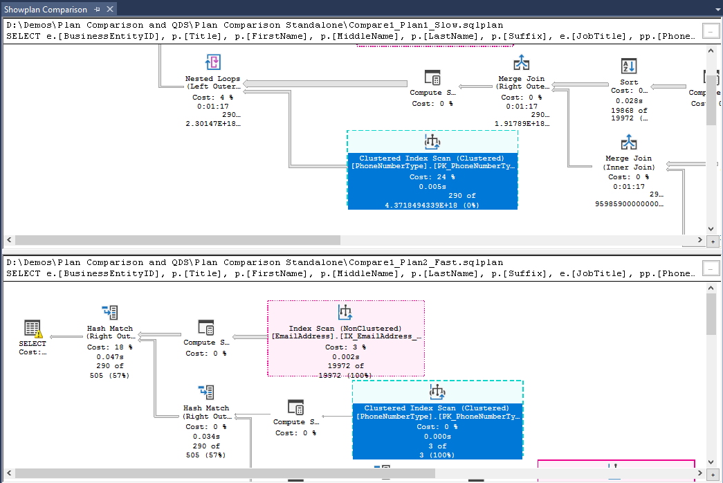 比较两个执行计划时,计划中执行基本相同的区域将以相同的颜色和图案突出显示。单击一个计划中的颜色区域会将另一个计划居中放在该计划中的匹配节点上。仍然可以比较执行计划的不匹配运算符和节点,但在这种情况下,必须手动选择要比较的运算符。