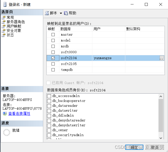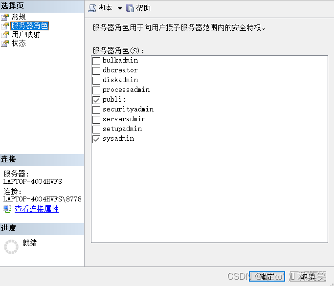 找到你的登录名(我的是yunmengze),双击服务器角色,将服务器角色的sysadmin选中: