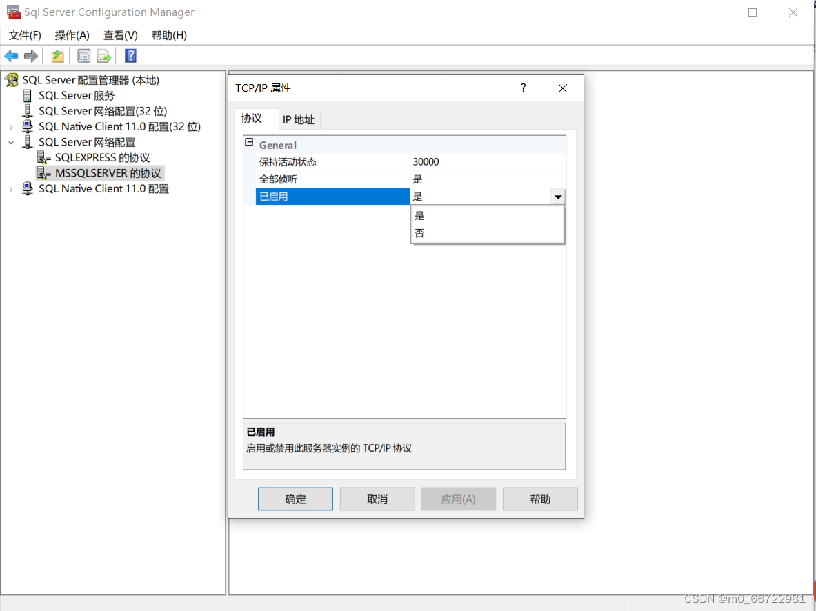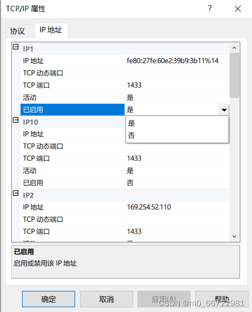 将IP1、IP2的启用改为是,观察TCP端口是不是1433。(一共改两个)