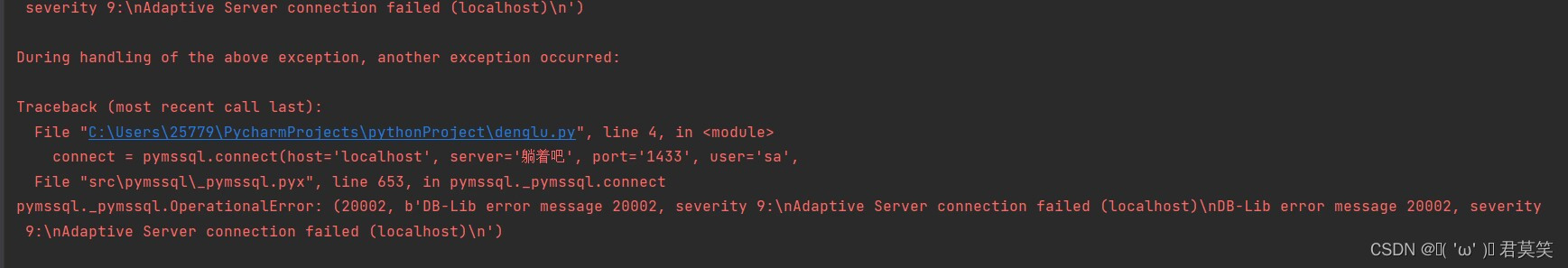 connect = pymssql.connect(host='localhost',server='LAPTOP-40O6HVDS', port='1433',user='yunmengze', password= '123456', database='soft2104',charset="GBK")