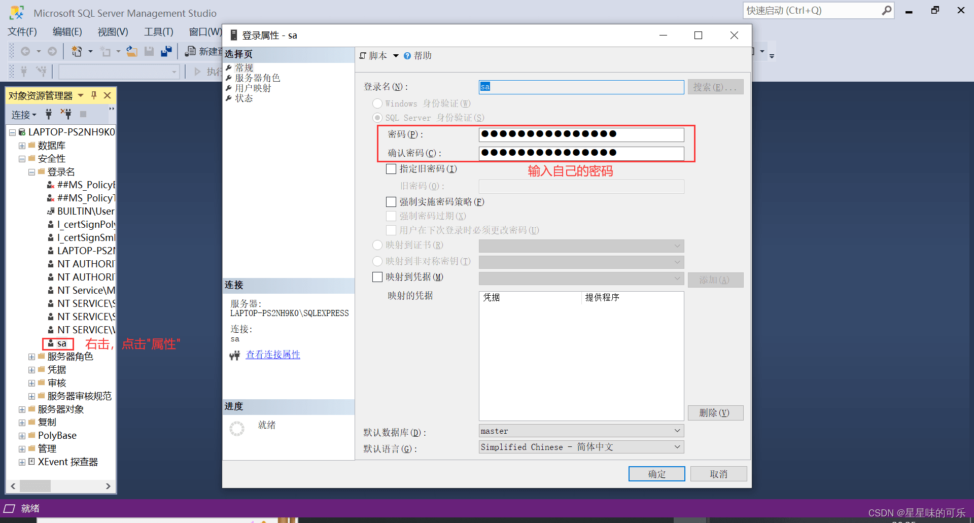 dbConn = DriverManager.getConnection(dbURL, "sa", "123");//这里的密码改为第一步你所修改的密码,用户名一般就为"sa"