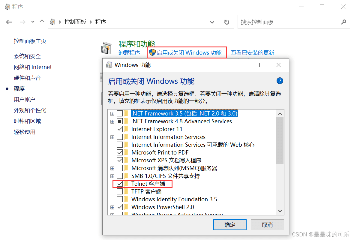 打开控制面板,点击“程序”,点击“启用或关闭Windows功能”,打开Telnet服务。