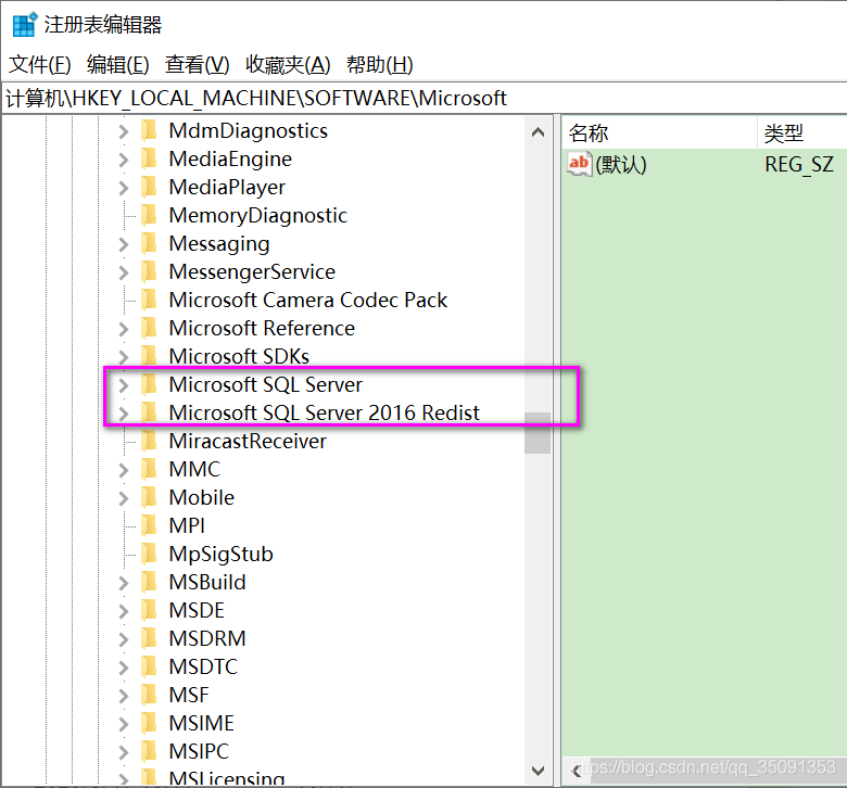 2.删除HKEY_LOCAL_MACHINE\SOFTWARE\Microsoft下包含Microsoft SQL Server的文件夹: