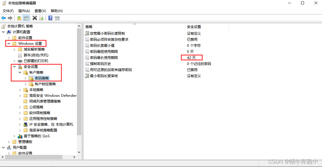 按照下图打开选择密码策略 修改密码最长使用期限,就可以达到 延长效果了