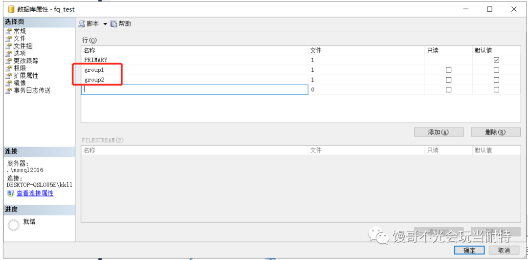 选中数据库=>属性=>文件组,添加group1,group2两个文件组。