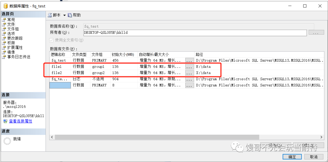 选中数据库=>属性=>文件。添加file1,文件组选group1,路径选择一个文件目录。这里选择E盘data目录。添加file2,文件组选择group2,路径选择一个文件目录。这里选择X盘的data目录。这样当分区的时候数据就会落在这2个目录下。这里的路径可以选择在同一个硬盘,但是为了更高的读写性能,如果有条件建议直接指定在不同的硬盘下。