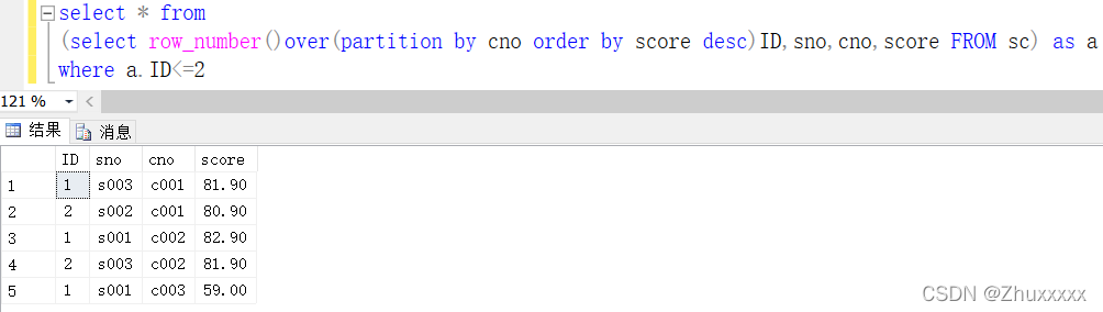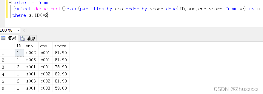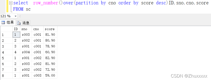 可以看到ID的值以cno为分区进行排序,当cno变化时ID也会自动重新开始计数,然后再将成绩以降序排列,这样每科成绩高低及其对应的学号就一目了然。