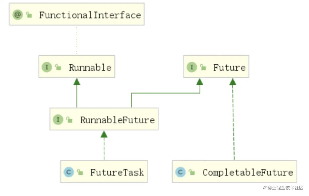 CompletableFuture类实现了Future接口,所以你还是可以像以前一样通过get方法阻塞或者轮询的方式获得结果,但是这种方式不推荐使用。 CompletableFuture和FutureTask同属于Future接口的实现类,都可以获取线程的执行结果。