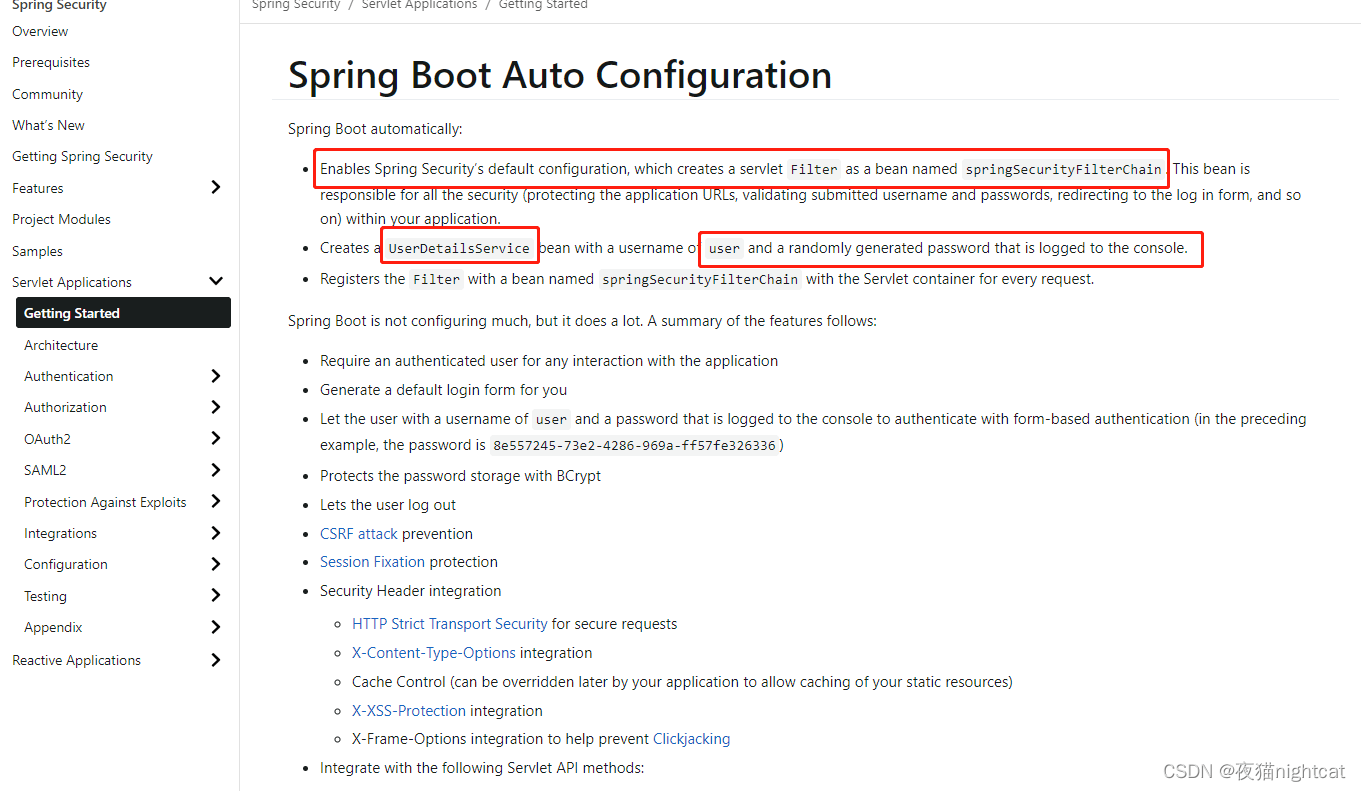 这个密码显然不是我们想要的,总不能每次启动项目,都生成一个新的密码,而且用户名也不可能都叫做user,我们希望能自己定制用户名和密码。我们现在并不知道该怎么做。继续读文档。