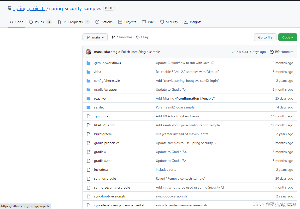 我们看到了,SpringSecurity提供的例子,有199次提交,我们找到最开始的几次提交记录。看看它都做了什么。