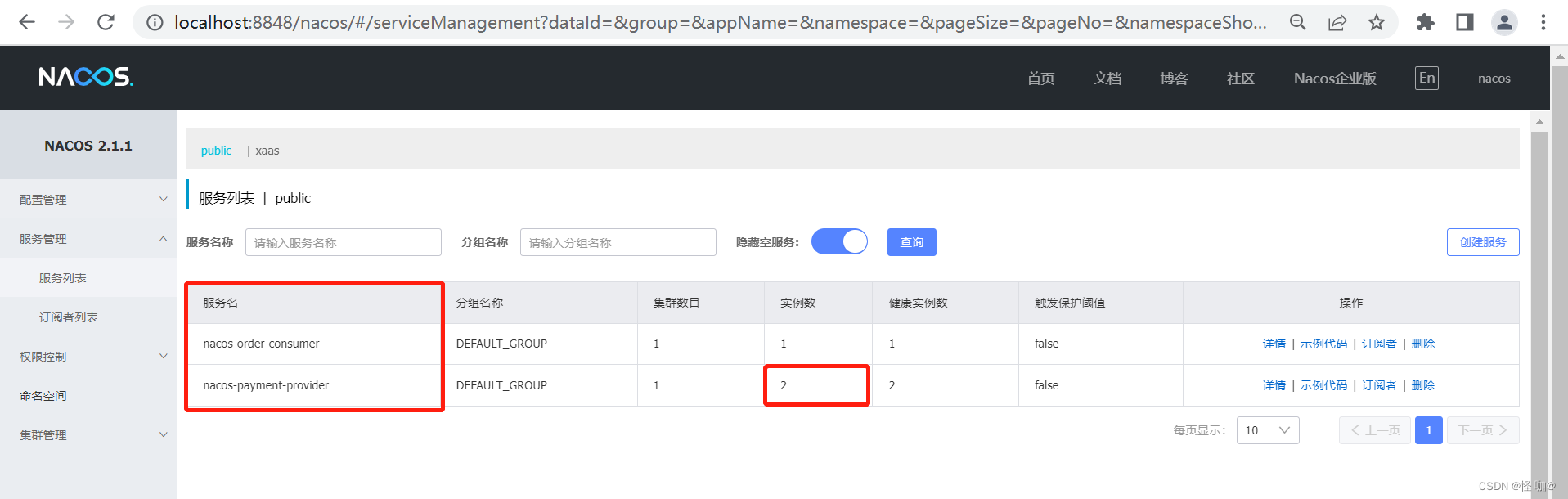 本篇示例我就以Nacos注册中心为例了,下面是我注册的两个服务。其中nacos-payment-provider服务是集群,有两个实例。
