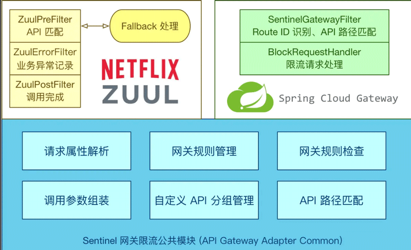 Sentinel 1.6.0 引入了 Sentinel API Gateway Adapter Common 模块,此模块中包含网关限流的规则和自定义 API 的实体和管理逻辑: