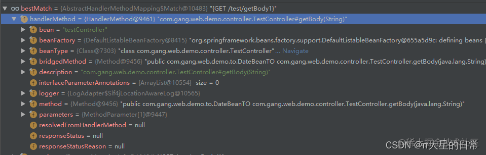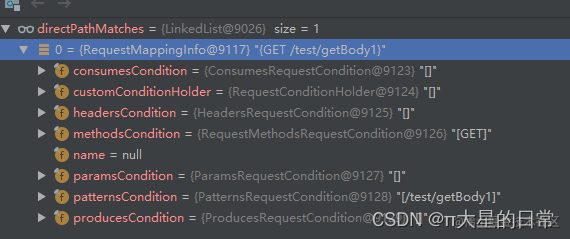 以下2个图分别是请求的匹配Condition和HandlerMethod中描述的处理类 , 这样的集合在 S2 环节注入>>