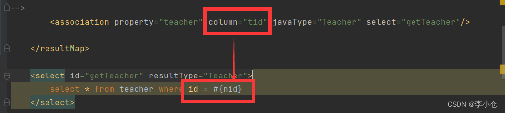 - teacher中的id的传递是根据student中得到的tid,将tid传给id,因此#{}中取什么名字都可以。