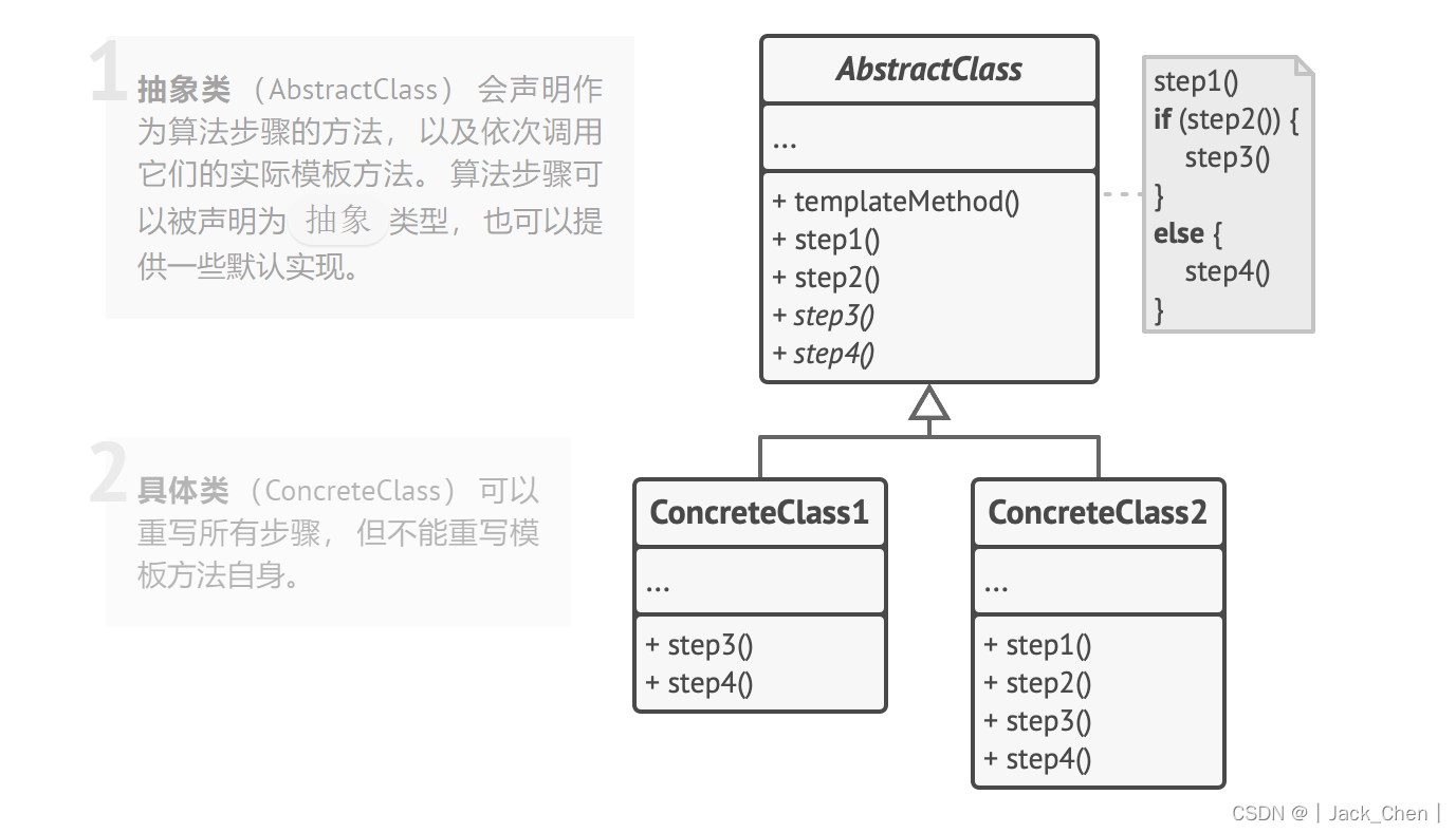 模板方法模式属于行为型设计模式。它是指定义一个操作中的算法的框架,而将一些步骤延迟到子类中。使得子类可以不改变一个算法的结构即可重定义该算法的某些特定步骤。