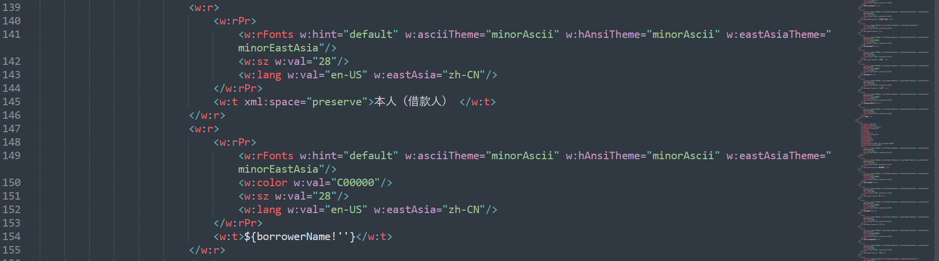 另外,强烈不建议在word文件中去编辑设置模板变量,因为.docx文件在另存为.xml文件后,原先好好的一个变量可能就被拆开了,建议另存为之后再用文本编辑器打开去编辑。
