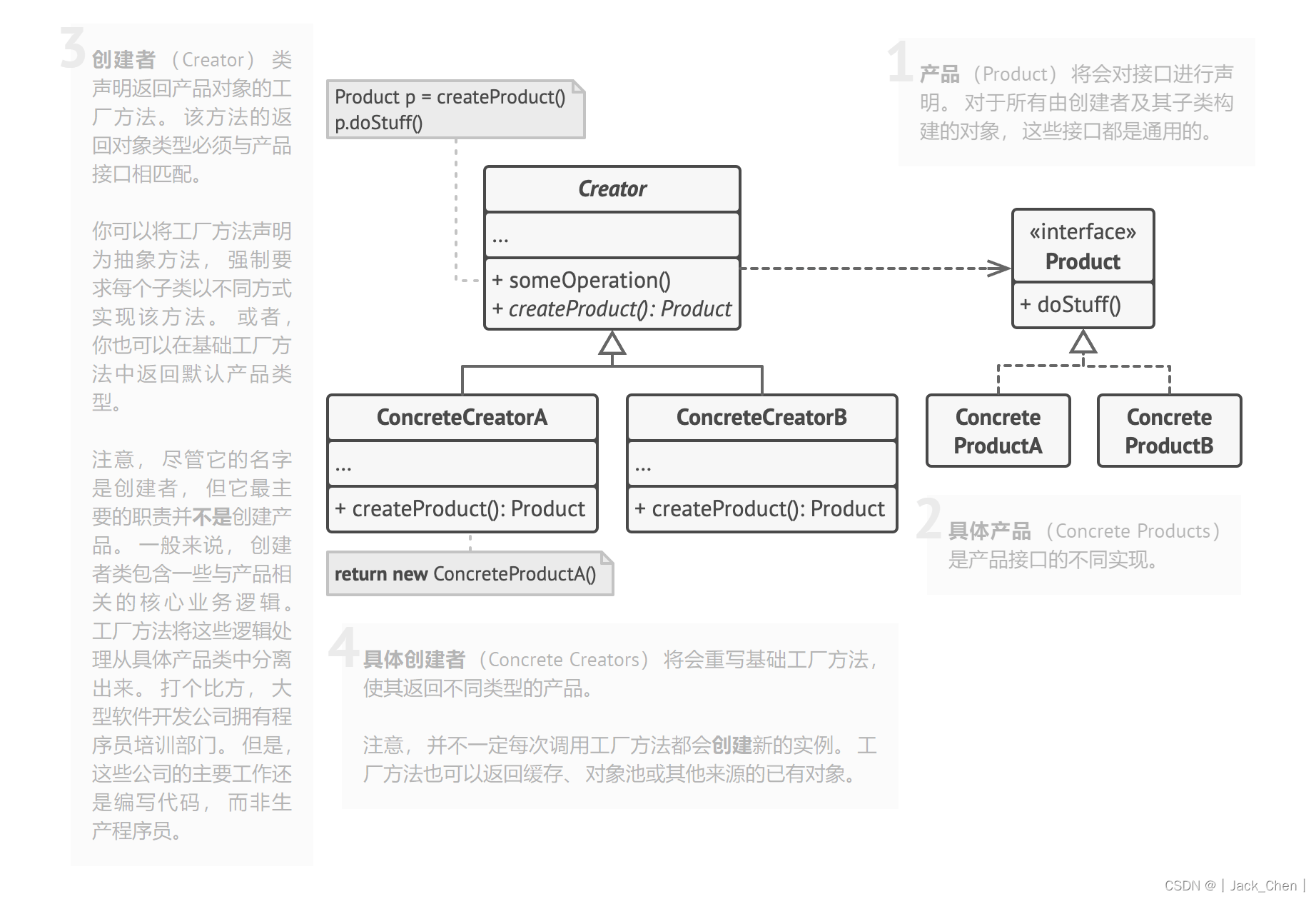 工厂方法模式(FACTORYMETHOD)是一种常用的类创建型设计模式,此模式的核心精神是封装类中变化的部分,提取其中个性化善变的部分为独立类,通过依赖注入以达到解耦、复用和方便后期维护拓展的目的。它的核心结构有四个角色,分别是抽象工厂、