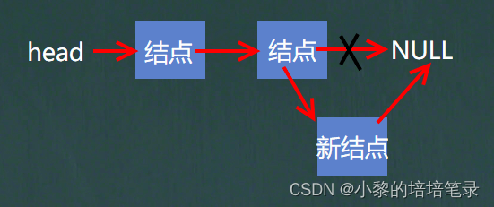 将新的结点添加到链表的尾部,我们首先要遍历链表,找到链表的尾部,然后将最后一个结点的next指向新的结点,新结点的next指向NULL,这样就完成了链表的添加操作,这种每次添加到链表的尾部的操作称为尾插法。注意,当我们遍历链表时,需要一个辅助结点temp来进行遍历,因为head头结点不能动。