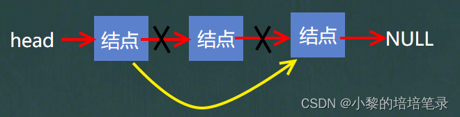 假设我们要删除中间这个结点,我们只需要将这个结点的上一个结点的next指向这个结点的下一个结点(也就是将第一个结点的next指向第三个结点)。