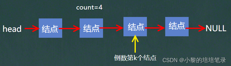 从上图可以看出,假设要找倒数第2个结点,我们该怎么做?不难看出,倒数第二个结点也是顺序的第三个结点,也就是将倒数的结点转换成顺序结点,遍历链表找到顺序结点即可。因为是有明确表示是第几个结点,所以我们需要知道结点的有效个数,前面我们介绍了有效个数的求法,直接用即可。当我们要找倒数第k个结点,我们可以转换成顺序的第(count - k + 1)个结点。比如:k = 2,count = 4, 倒数第2个结点也就是顺序第(4 - 2 + 1 = 3)个结点。