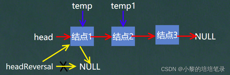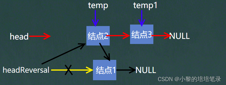 //然后将temp的next指向新链表头headReversal的next(头指向的下一个)