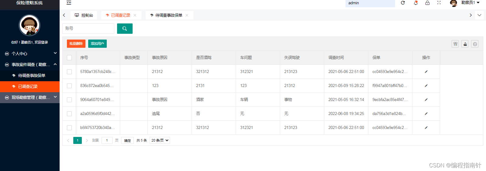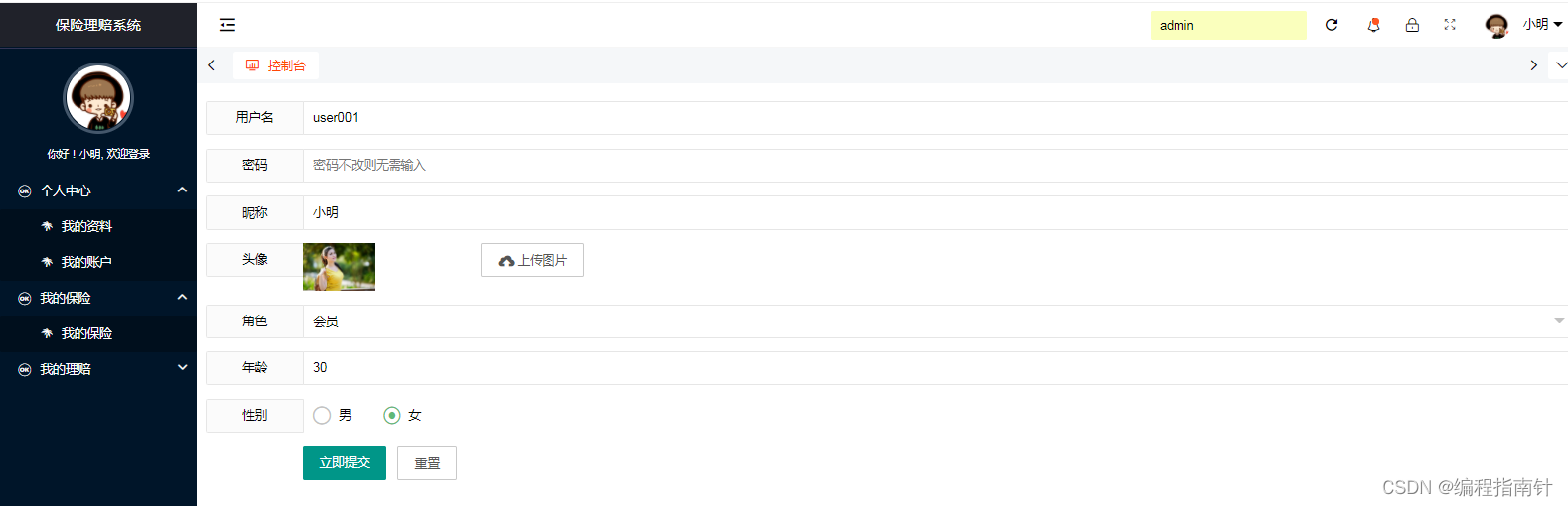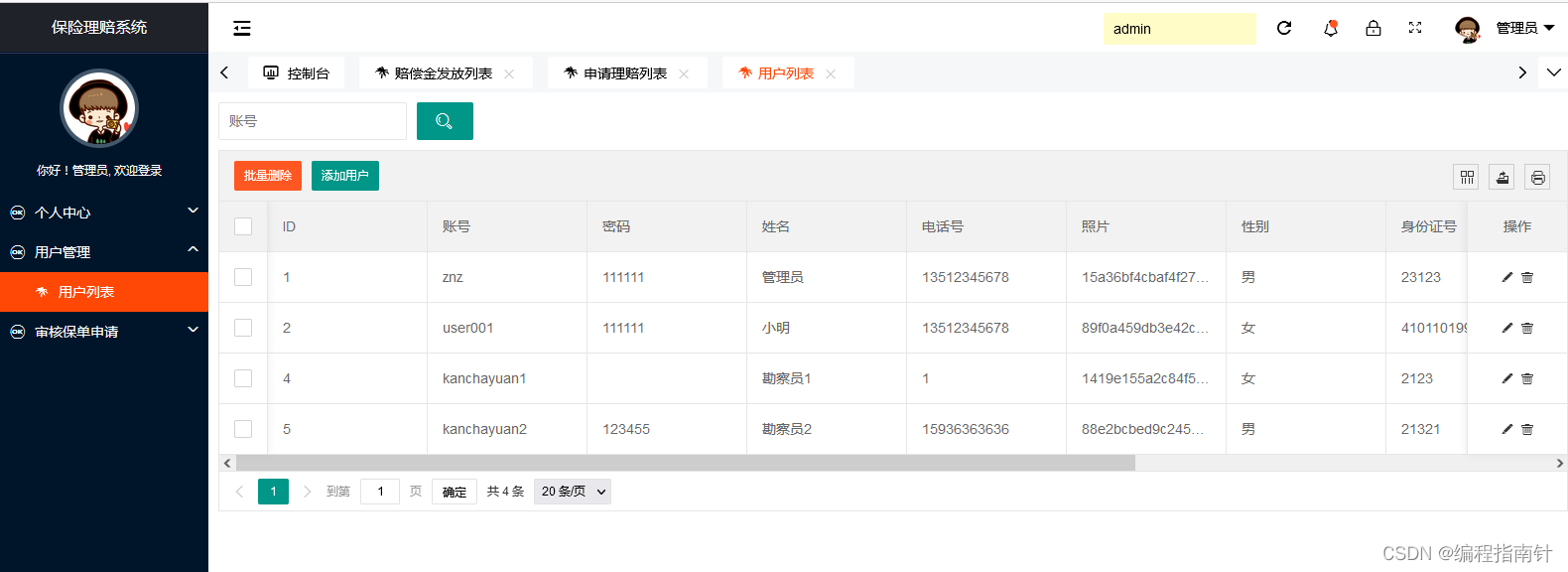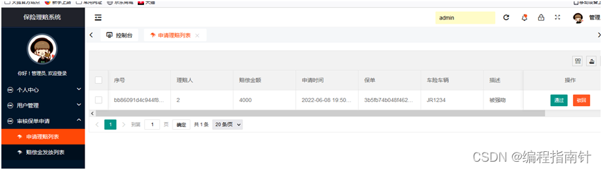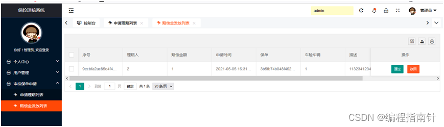 管理员功能:个人资料管理,用户管理,理赔审请审核,赔偿金发放管理
