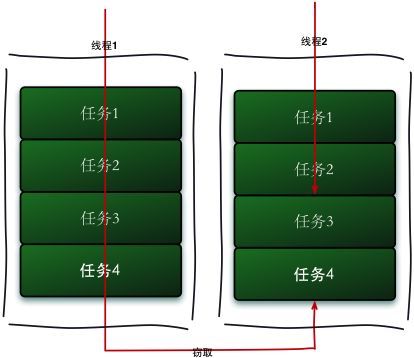 那么为什么需要使用工作窃取算法呢?假如我们需要做一个比较大的任务,我们可以把这个任务分割为若干互不依赖的子任务,为了减少线程间的竞争,于是把这些子任务分别放到不同的队列里,并为每个队列创建一个单独的线程来执行队列里的任务,线程和队列一一对应,比如A线程负责处理A队列里的任务。但是有的线程会先把自己队列里的任务干完,而其他线程对应的队列里还有任务等待处理。干完活的线程与其等着,不如去帮其他线程干活,于是它就去其他线程的队列里窃取一个任务来执行。而在这时它们会访问同一个队列,所以为了减少窃取任务线程和被窃取任务线程之间的竞争,通常会使用双端队列,被窃取任务线程永远从双端队列的头部拿任务执行,而窃取任务的线程永远从双端队列的尾部拿任务执行。