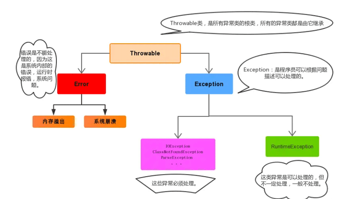 - Exception:表示异常,异常产生后程序员可以通过代码的方式纠正,使程序继续运行,是必须要处理的。好比感冒、阑尾炎。