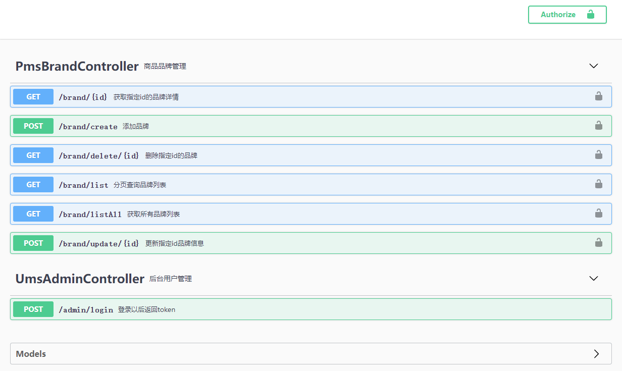 首先我们准备一个服务来方便远程调用,使用的是之前的mall-tiny-swagger这个Demo,打开Swagger看下,里面有一个登录接口和需要登录认证的商品品牌CRUD接口,