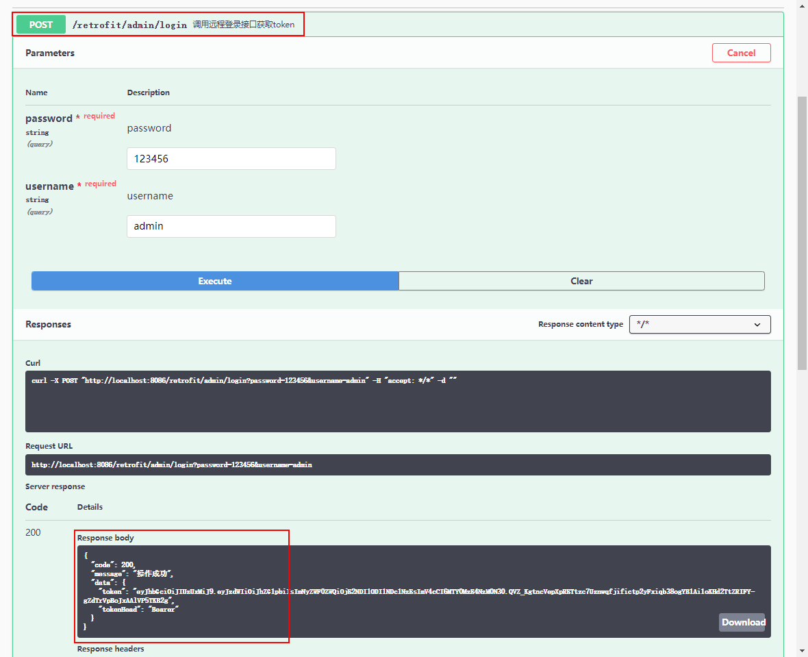 接下来通过Swagger进行测试,调用接口就可以获取到远程服务返回的token了,访问地址:http://localhost:8086/swagger-ui/