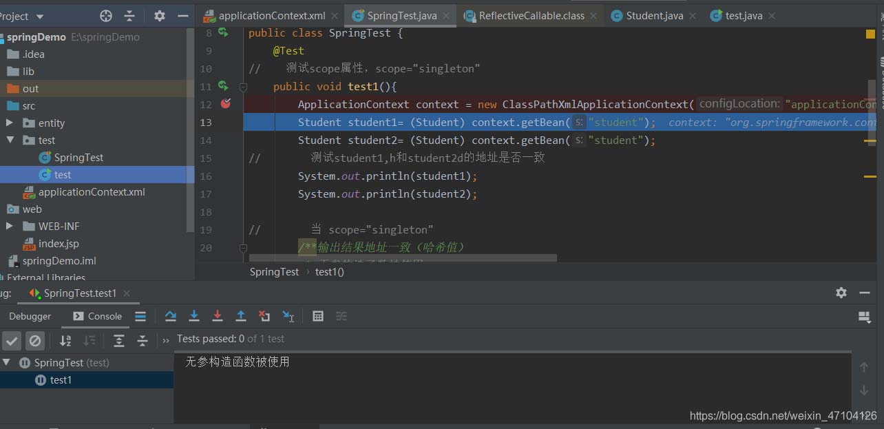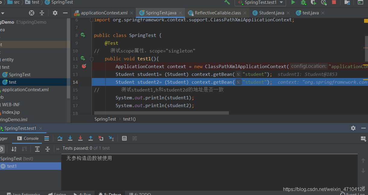在输出的结果中我们可以看出,当设置为singleton时,加载的两个Student的哈希值一致,同时无参构造函数被调用一次,如果通过断点测试可以发现在加载文件时,无参构造函数就已经被调用(如下图)