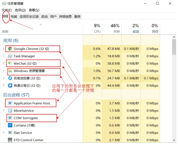 - 进程:是指一个内存中运行的应用程序,每个进程都有一个独立的内存空间,一个应用程序可以同时运行多个进程;进程也是程序的一次执行过程,是系统运行程序的基本单位;系统运行一个程序即是一个进程从创建、运行到消亡的过程。