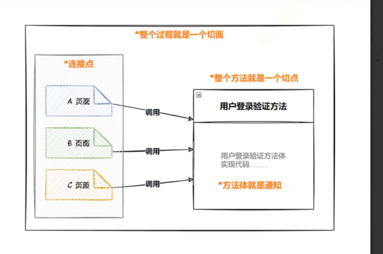- 切点:切点是切面中的某一个方法,用户登录验证方法就是一个切点。