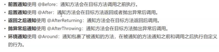 - 通知: 切点是一个空方法,通知是具体实现了这个方法,通知相当于切点的方法体。通知包括:前置通知,后置通知,返回之后通知,抛异常后的通知,环绕通知