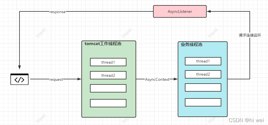 - tomcat接收到客户端的请求后会将请求AsyncContext交给业务线程,这样tomcat工作线程就能释放出来处理其它请求的连接。