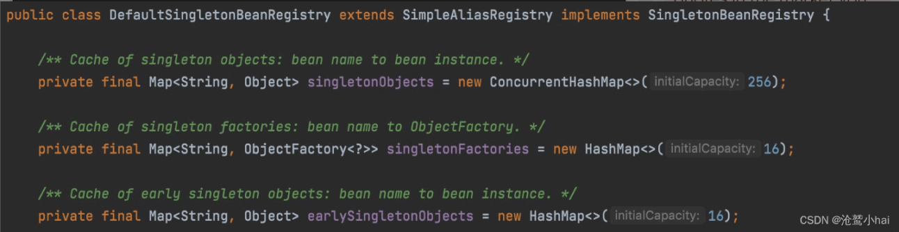 singletonObjects:俗称单例池,缓存创建完成的单例BeansingletonFactories:映射创建Bean的原始工厂earlySingletonObjects:映射Bean的早期引用,也就是说这个Map里的Bean不是完整的,只是完成了实例化,但还没有初始化